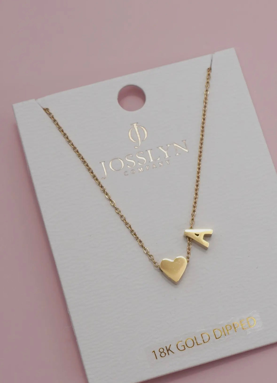 This classic and timeless letter necklace features a dainty uppercase initial and heart charm necklace. Effortlessly chic and dainty. This will look great with your romper or puff hem dress.