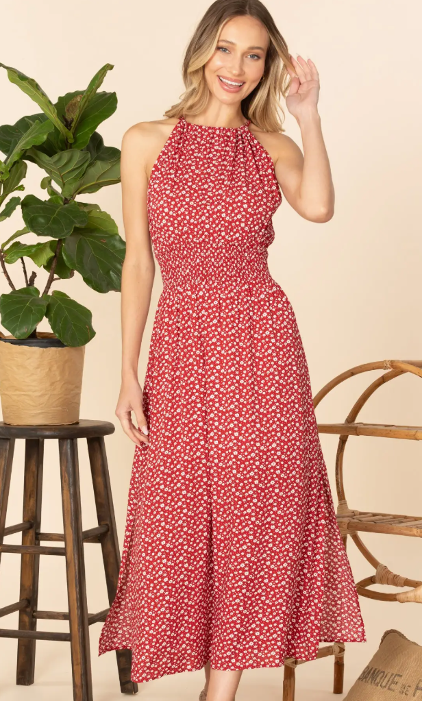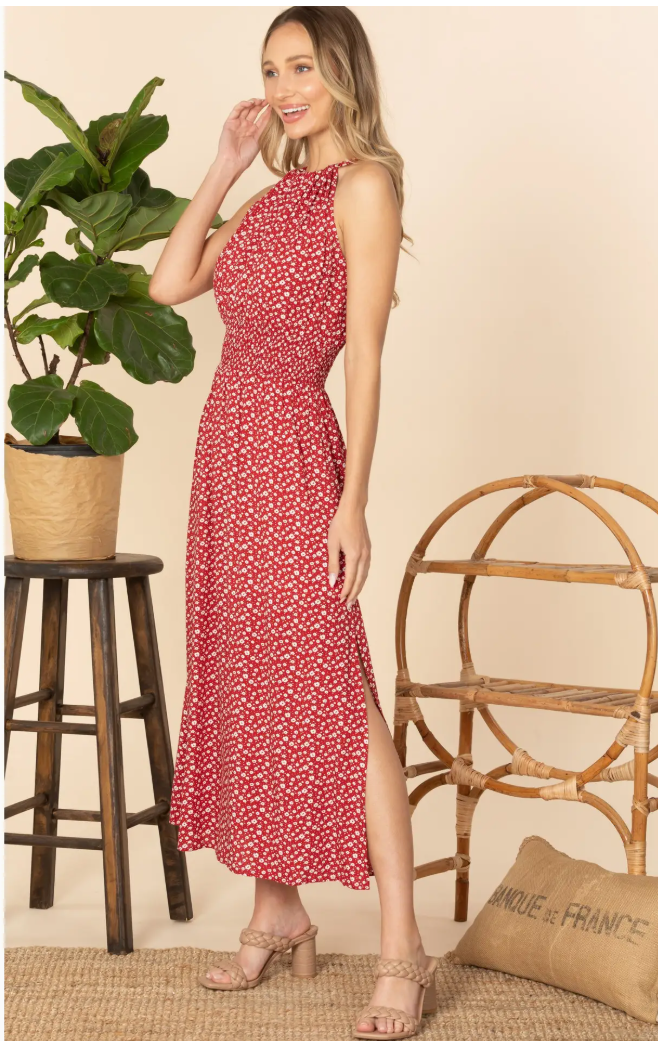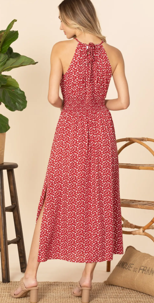 Floral Gathered Neckline Midi Dress with Slit.