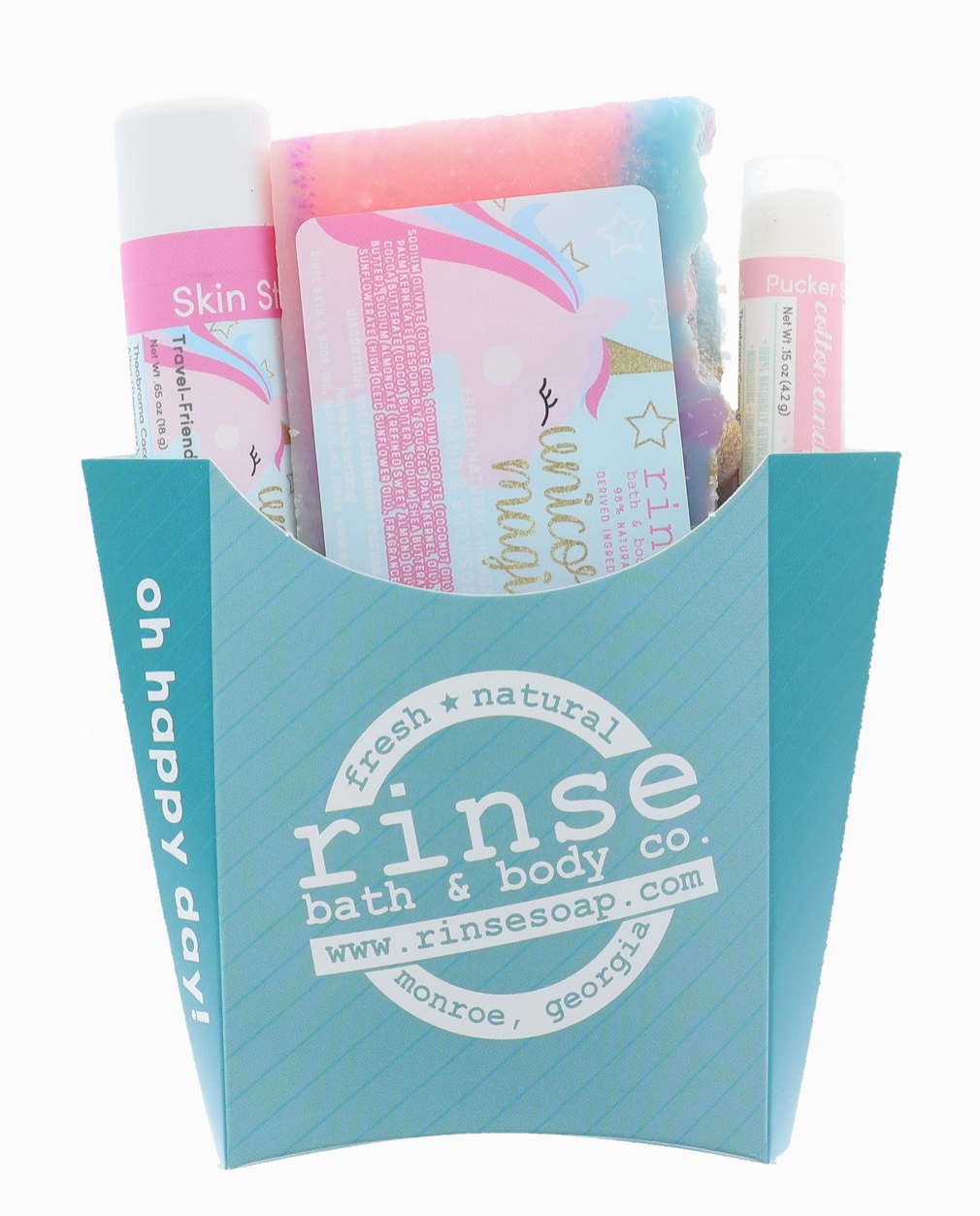 Our Unicorn Fry Box contains one bar of Unicorn Magic soap, one Unicorn Magic Skin Stick, and one Cotton Candy Pucker Stick.